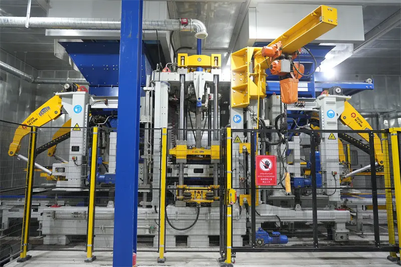 उत्पादन लाइनको मूल उपकरणले QGM द्वारा नयाँ विकास गरेको ZN1500-2C ब्लक फारमिङ मेसिन प्रयोग गर्दछ, जसले धेरै प्याटेन्टेड प्रविधिहरूलाई एकीकृत गर्दछ। उपकरण एक बुद्धिमान द्रुत मोल्ड परिवर्तन प्रणाली संग सुसज्जित छ, जसले तुरुन्तै विभिन्न उत्पादनहरू जस्तै फुटपाथ ईंटहरू र पारगम्य ईंटहरू उत्पादन गर्न स्विच गर्न सक्छ; औद्योगिक इन्टरनेट प्लेटफर्ममा आधारित, यसले उत्पादन डेटाको वास्तविक-समय निगरानी र बुद्धिमानी विश्लेषण महसुस गर्छ, उपकरण विफलता चेतावनी प्रतिक्रिया समय 60% द्वारा छोटो बनाउँछ, र महत्त्वपूर्ण रूपमा सञ्चालन र मर्मत दक्षता सुधार गर्दछ।