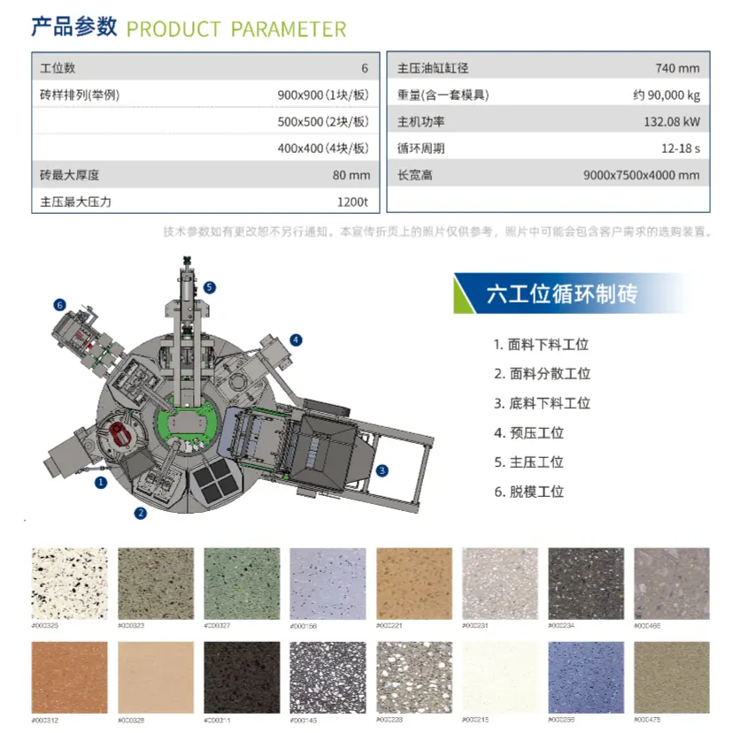 HP-1200T रोटरी टेबल स्ट्याटिक प्रेसले रचनात्मक रूपमा ईंट बनाउने प्रक्रियालाई 7 वटा स्टेशनहरूमा विभाजन गर्दछ, गोलाकार लेआउटमा व्यवस्थित गरिएको छ, भुइँको ठाउँ घटाउँदै, र ठूलो मोल्डिङ क्षेत्र र मोल्डिङ उचाइ दायरा छ, यो सुनिश्चित गर्दै कि ग्राहकहरूको विभिन्न आवश्यकताहरू नक्कल ढुङ्गा कंक्रीट ब्लक उत्पादनहरूमा ग्यामेटरी ग्यामेटी भरिएको छ। ढुङ्गा ईंट मिसिनहरू। यसको तयार गरिएको समूह मानक "T/CCMA 0125-2022 रोटरी मल्टि-स्टेशन स्टेटिक प्रेस कंक्रीट ब्लक फारमिङ मेसिन" लाई 2023 मा उद्योग र सूचना प्रविधि मन्त्रालयको 100 समूह मानक अनुप्रयोग प्रदर्शन परियोजनाहरू मध्ये एकको रूपमा चयन गरिएको छ।